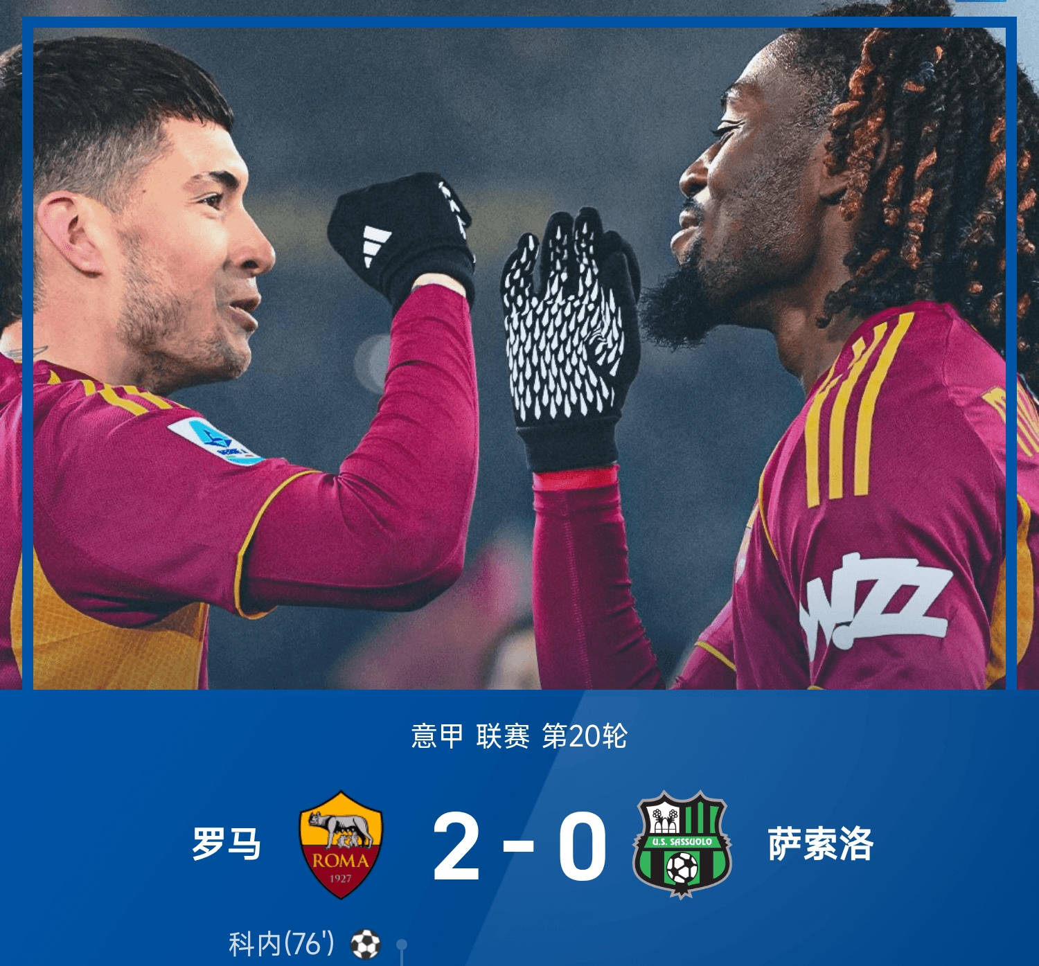 布雷夏尼尼反超比分,五分钟后,弗拉霍维奇兜射扳平比分,上演梅开二度下半场,洛卡特利远射造险,麦肯尼伤退,补时最后时刻。